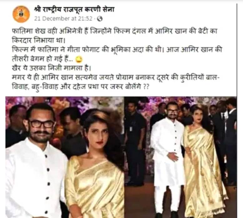 আমির ও ফতিমার যে ছবিটি সম্প্রতি ভাইরাল হয়েছে সেখানে ফতিমাকে দেখা যাচ্ছে গোল্ডেন রঙের শাড়ি পড়ে আমিরের পাশে দাঁড়িয়ে ফতিমা। বোঝাই যাচ্ছে কোনও অনুষ্ঠানে গিয়েছেন দু’জনে। তবে আরও একটু ভাল করে খেয়াল করলে দেখা যাবে ছবিটি তৈরি করা। আমির ও কিরণের পুরনো একটি ছবিতে কিরণের জায়গায় ফতিমার মুখ বসানো হয়েছে। যিনি এই ছবিটি পোস্ট করেছেন তিনি কার্যত আমির খানকে আক্রমণ করার জন্যই যে করেছেন তা নিয়ে কোনও সন্দেহ নেই। তিনি ছবিটি পোস্ট করে লেখেন, ‘‘এই সেই আমির খান যিনি সত্যমেব জয়তে তৈরি করে ছোটদের বিয়ে, বহু বিবাহ, পণ প্রথার উপর নিশ্চি বলবে।’’